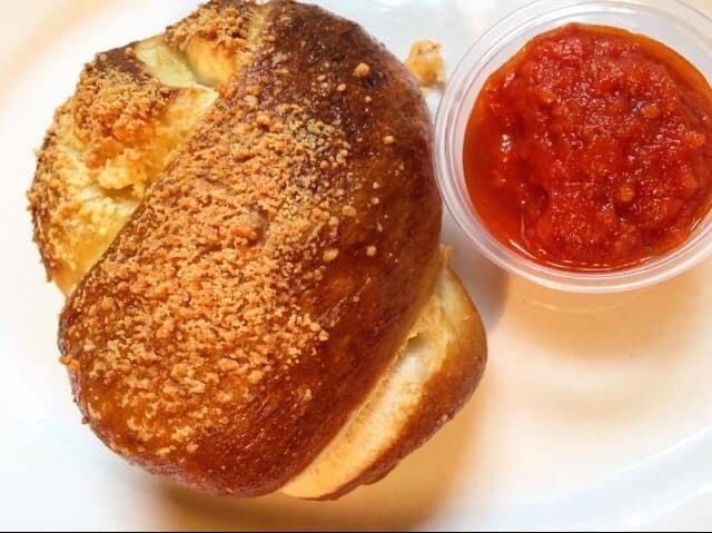 These meal sized pretzels are handmade from start to finish! Stuffed with pepperoni, mozzarella and pizza sauce. Served with a side of our house marinara sauce.
